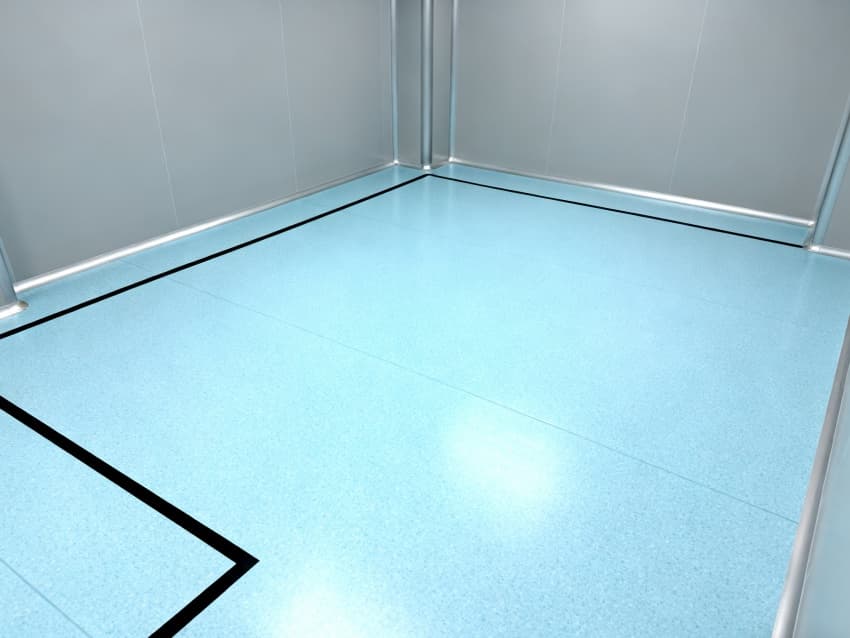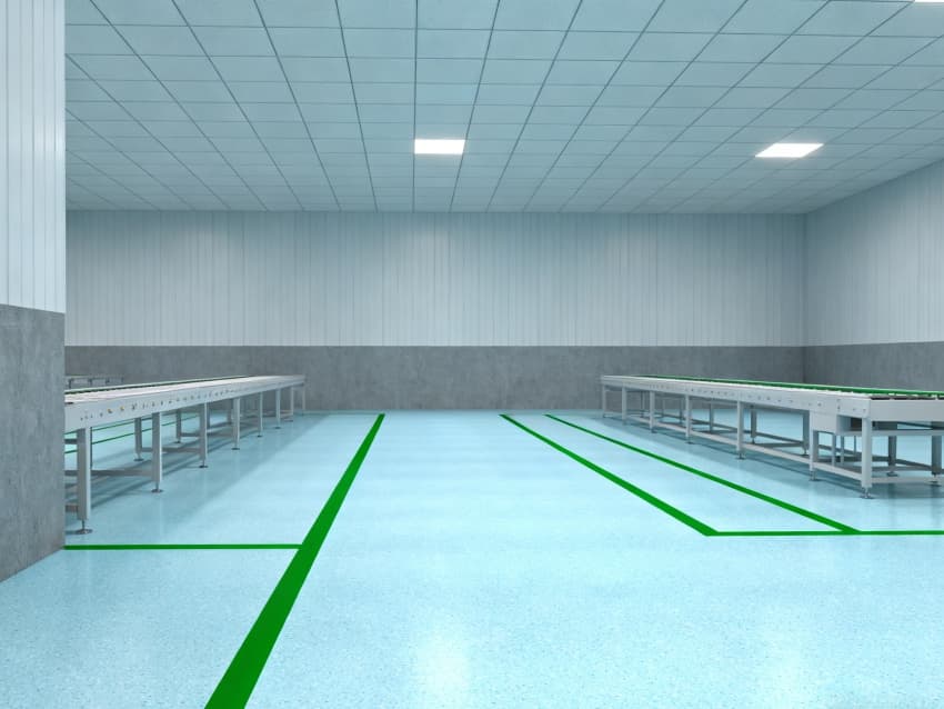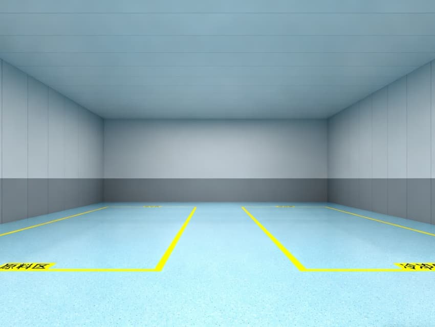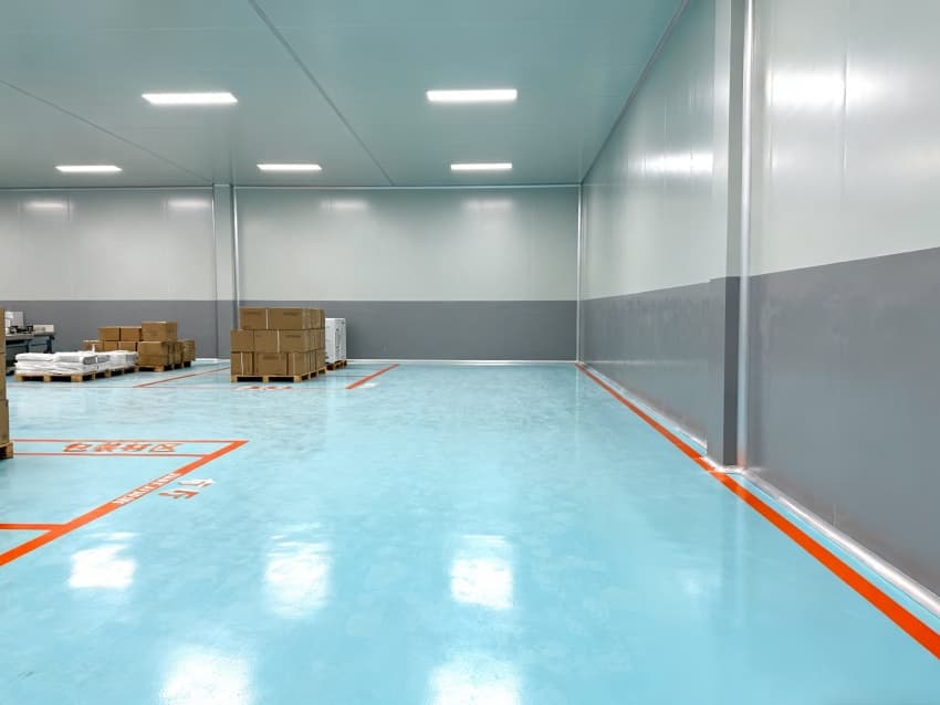 車間統一采用淺藍色耐磨環氧地面,兼具抗沖擊、易清潔特性,適配鈑金加工、總裝等多環節的設備安裝與物料轉運需求;四周灰色防霉墻壁經耐污處理,耐磨損且不易顯臟,配合頂部均勻布光系統,營造明亮舒適的生產環境。?
