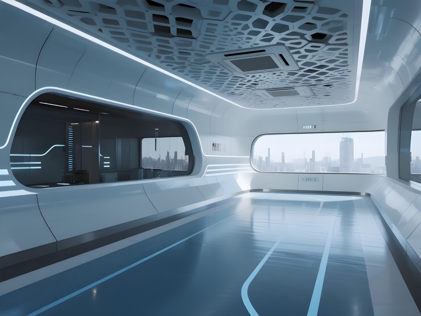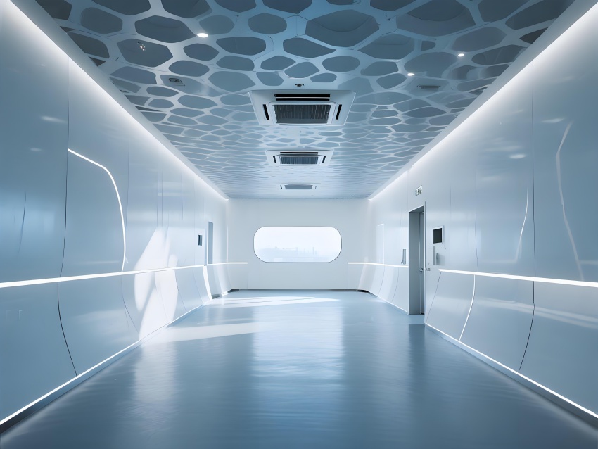本車間空間以冰川藍與鈦白為主色調(diào),弧形墻角與無縫地坪構(gòu)成流暢的潔凈界面,頂部蜂窩狀FFU陣列形成科技感天花肌理。灌裝區(qū)透明亞克力防護罩展示自動化生產(chǎn)線運作,配合層流工作臺的紅色氣流可視化設計,強化無菌核心概念。功能模塊通過地面灰色導視帶串聯(lián),設備區(qū)的鏡面不銹鋼與控制面板的藍色背光形成冷調(diào)光效。玻璃觀察窗嵌入電子壓差計,走廊的漸變光環(huán)境引導系統(tǒng)在滿足GMP動態(tài)監(jiān)測要求的同時,營造出未來實驗室般的專業(yè)氛圍,緩解員工長時間密閉作業(yè)的疲勞感。