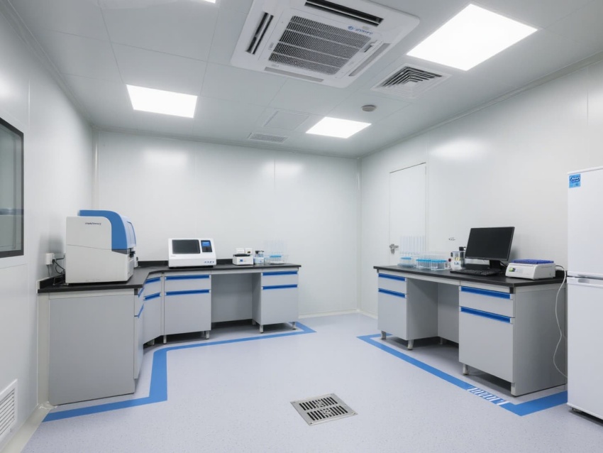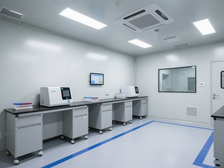 頂部高效過濾器與定向氣流系統維持每小時12-15次空氣置換,確保潔凈度達標。墻面嵌入式消毒裝置與紫外燈系統,可實現每日全方位消殺。實驗區配備負壓通風柜與生物安全柜,臺面采用耐腐蝕環氧樹脂材質,適配PCR反應的精密操作。