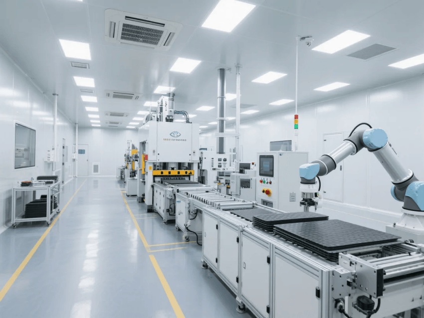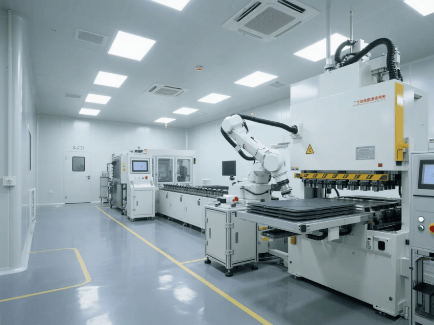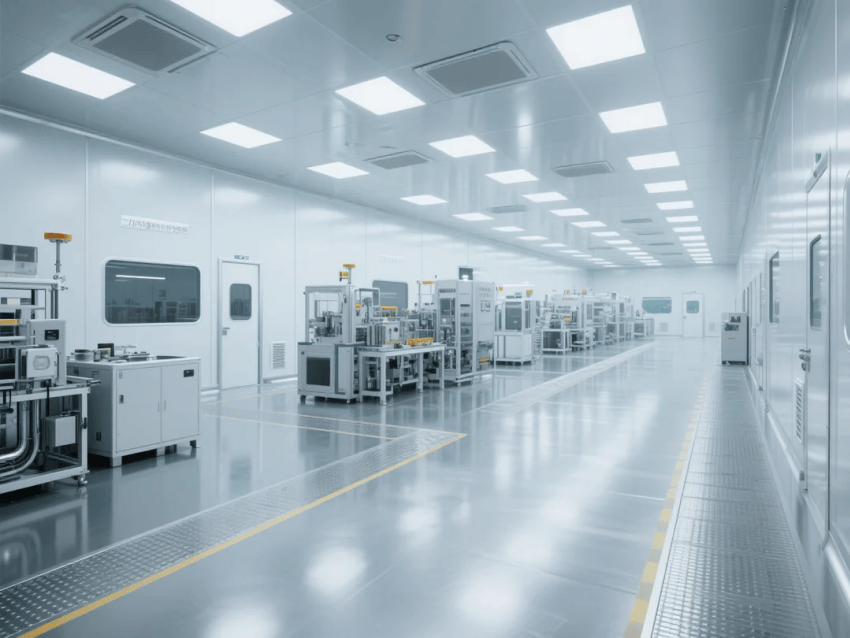 智能化配置:集成環(huán)境監(jiān)測(cè)與設(shè)備聯(lián)動(dòng)系統(tǒng),白色彩鋼板墻面嵌裝LED智能看板,實(shí)時(shí)顯示生產(chǎn)數(shù)據(jù)與潔凈參數(shù)。機(jī)械臂工作站配備藍(lán)光定位系統(tǒng),與金屬灰地坪形成科技視覺呼應(yīng)。