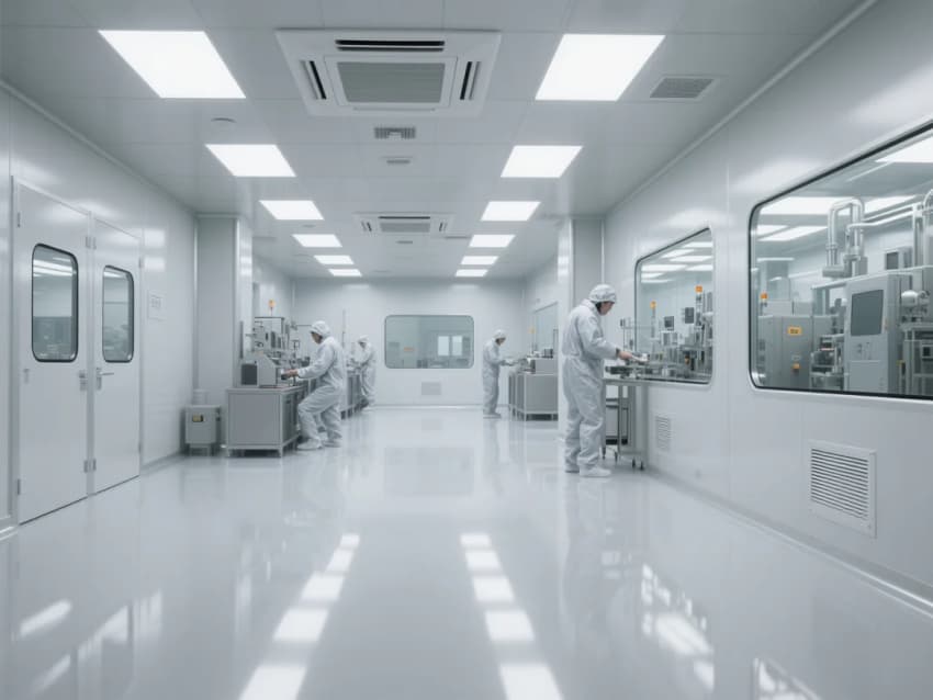 本方案采用"科技極簡主義"風格,以ISO 5級(萬級)潔凈標準為核心。空間設計強調線性流動感,灰白主色調搭配防靜電環氧樹脂地坪,墻面采用抗菌彩鋼板。頂棚網格化FFU送風單元配合側墻回風,形成垂直層流。功能分區明確,包含更衣緩沖間(Class 7)、核心生產區(Class 5)、設備維護通道。智能控制系統集成溫濕度(22±1℃/45±5%)、壓差(+10Pa)、粒子監測顯示。創新采用LED黃光照明減少光致氧化,設備基座增設主動減震系統。設計融合人機工程學,防靜電設施覆蓋率100%,通過藍色光帶引導潔凈動線,實現功能性與未來感的完美平衡。
