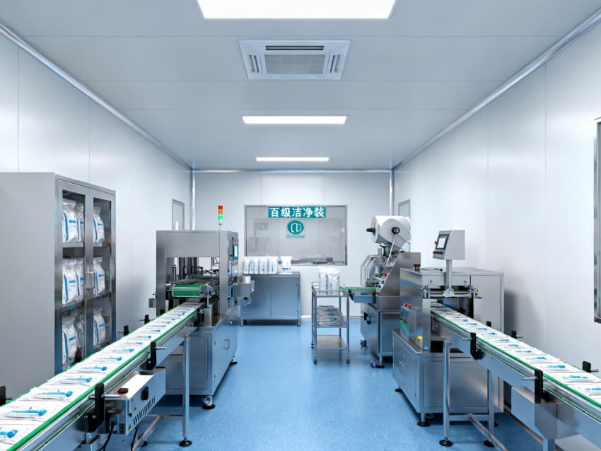 凈化配套設計全面:藍色地面具備抗菌、易消殺特性,配合地面導坡設計加速清潔排水,減少污漬殘留;白色墻面采用無縫抗菌涂層,消除清潔死角,降低微生物附著風險;全車間劃分獨立凈化分區,通過壓差控制預留設計隔絕不同潔凈等級區域,人流、物流通道分離避免交叉污染,全方位保障無菌生產環境穩定達標。