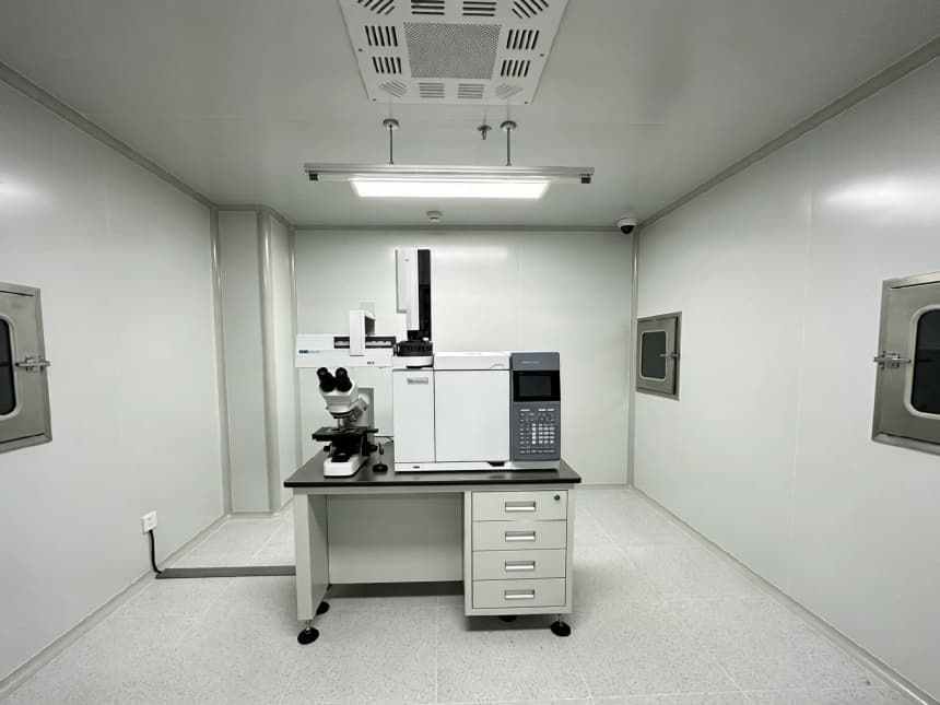 內部檢測空間均以淺灰色耐磨地坪搭配白色無縫潔凈墻面,視覺整潔且適配檢測核心需求。淺灰色地面選用高硬度環氧材質,抗壓耐磨、抗污易清潔,可耐受檢測過程中各類試劑殘留與設備搬運磨損;白色墻面采用環保抗菌涂層,平整度高、反光均勻,搭配嵌入式防眩光照明,為精密檢測提供清晰穩定的視覺環境,減少誤差干擾。