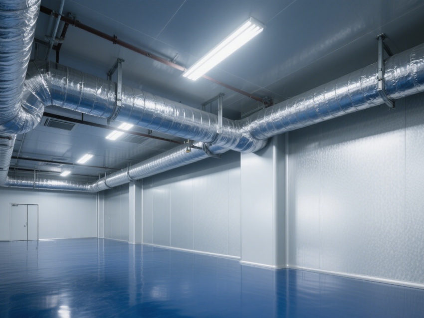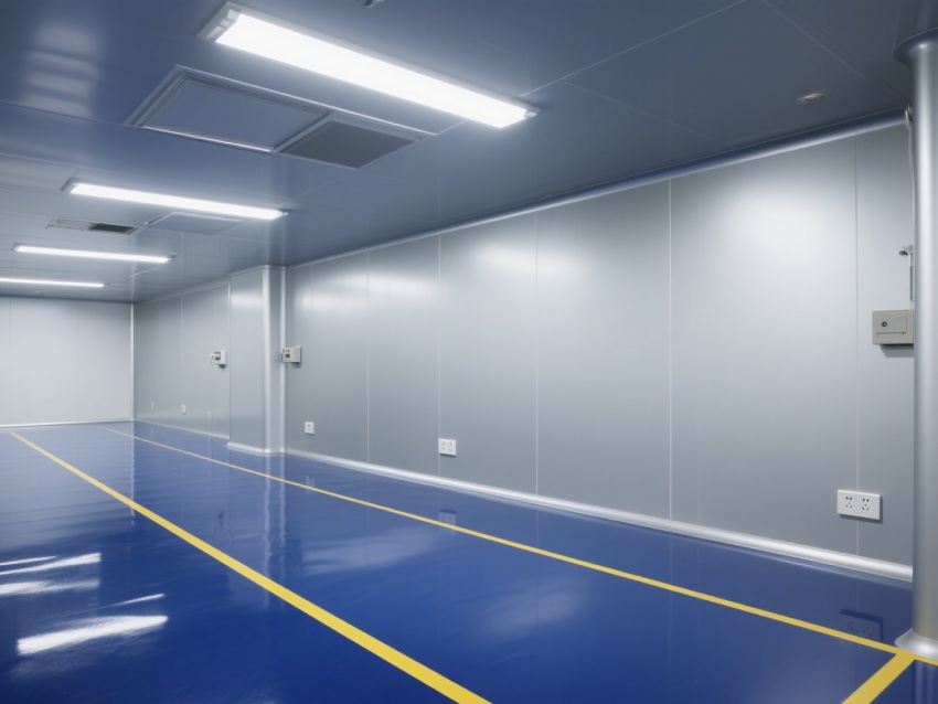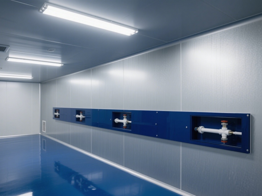 車間內(nèi)部整體呈銀灰色和藍(lán)色,給人一種現(xiàn)代感和科技感。墻面、地面和天花板均采用無縫設(shè)計(jì),便于清潔和消毒,防止灰塵和微粒的積聚。照明系統(tǒng)明亮且均勻,提供了良好的工作環(huán)境。