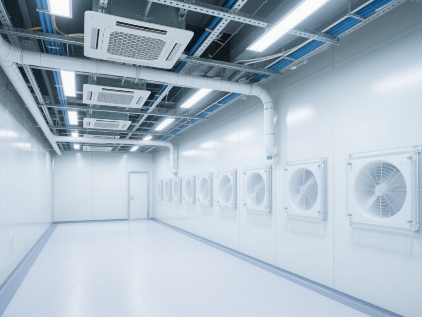 電子芯片廠無塵車間是芯片高精度生產的核心空間,其設計嚴格遵循百萬級潔凈標準。車間以銀白色抗菌彩鋼板搭建墻體與吊頂,搭配淺灰色防靜電環氧地坪,形成簡潔統一的視覺基調。頂部密布的高效過濾器與FFU風機組,通過層流方式持續凈化空氣,確保每立方米空氣中0.5微米以上的塵埃顆粒不超過3520個。?