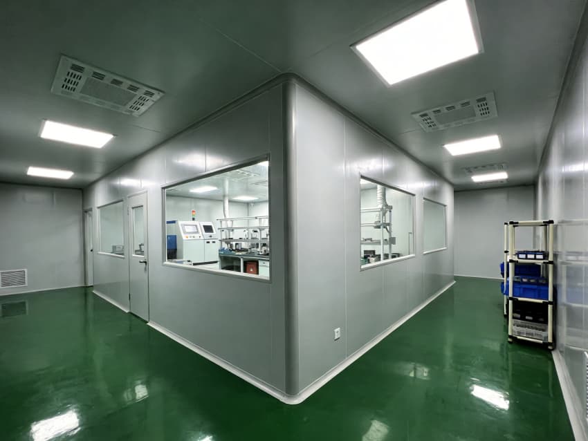 整體空間采用彩鋼板模塊化圍護系統(tǒng),墻面與頂板選用抗菌潔凈彩鋼板,搭配圓弧角收邊處理,徹底消除積塵死角;地面為綠色環(huán)氧自流平材質(zhì),兼具防靜電、耐磨、易清潔特性,滿足光器件生產(chǎn)對微塵管控的嚴苛要求。吊頂集成 FFU 風機過濾單元與回風系統(tǒng),可穩(wěn)定維持萬級潔凈度,為光芯片耦合、貼片封裝等核心工序筑牢環(huán)境基礎(chǔ)。