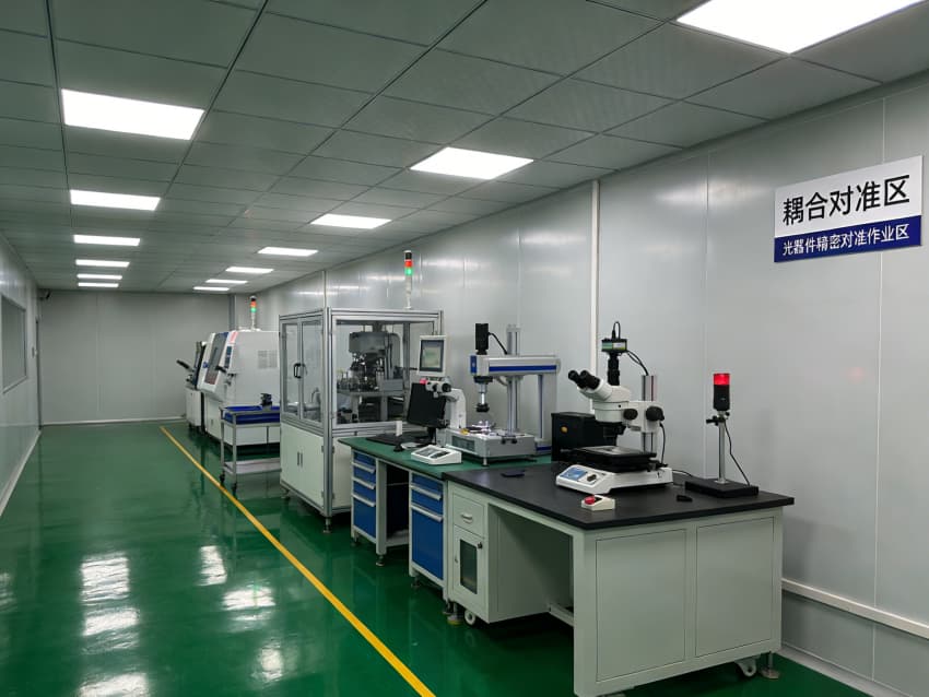 - 核心生產(chǎn)區(qū)以黃色警示線明確人車動線,SMT 貼片工位配備防靜電工作臺與遮光防塵罩,保障貼裝精度;“耦合對準區(qū)” 采用防震型實驗臺與光學級照明,搭配密閉玻璃隔斷,為光器件微米級對準作業(yè)提供穩(wěn)定、潔凈的操作環(huán)境。