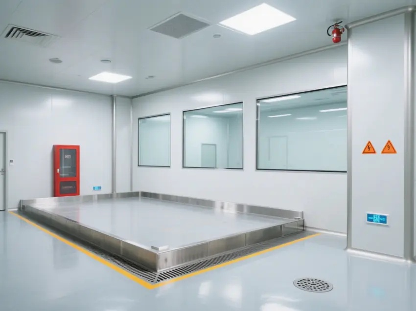 整個車間以白色為主色調,營造出干凈、整潔的氛圍。地面是光滑的淺灰色,帶有黃色的警示線,確保人員行走安全。車間內的墻壁和天花板都采用了平整的設計,便于清潔。