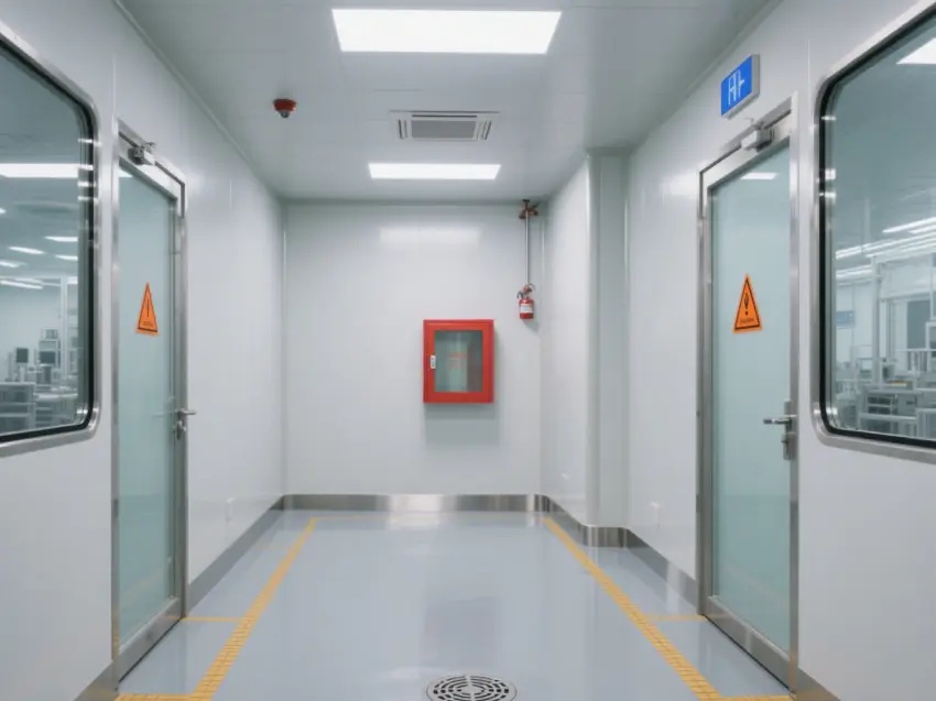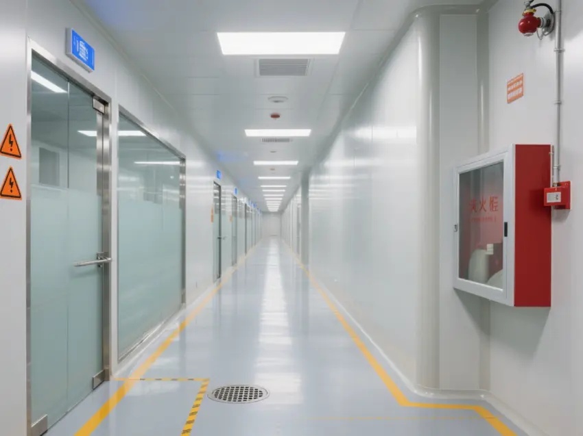 車間內配備了多個紅色的消防箱,確保消防安全。墻壁上還設有緊急出口標志,為人員在緊急情況下提供指引。車間內的門大多是玻璃門,便于觀察內部情況。