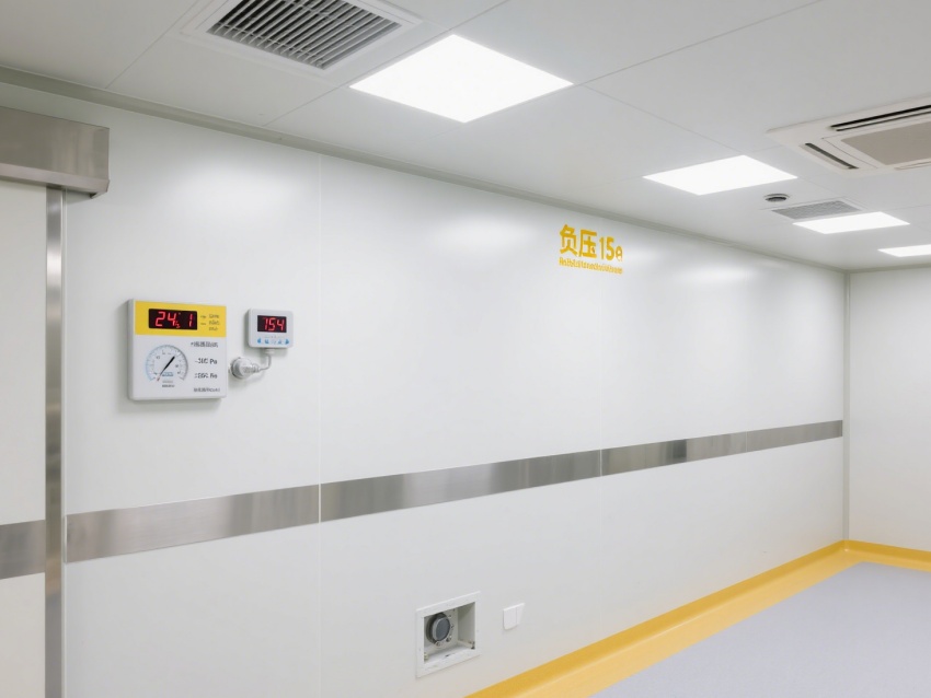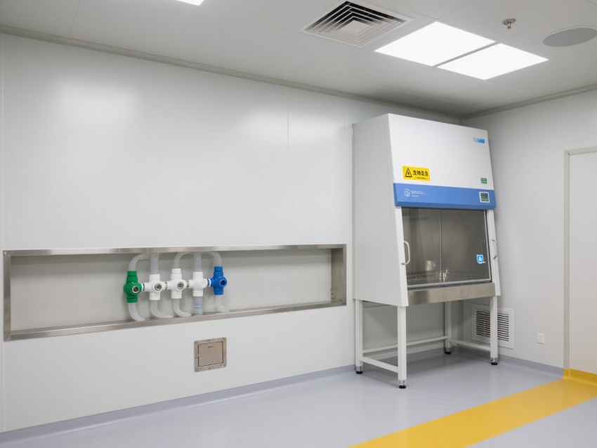 內(nèi)部設(shè)施專業(yè)且完善,生物安全柜為實(shí)驗(yàn)操作提供無(wú)菌防護(hù);各類氣路、水路接口布局規(guī)范,滿足檢測(cè)過(guò)程的資源供應(yīng);配備應(yīng)急沖眼設(shè)施與生物危害廢液處理區(qū),保障實(shí)驗(yàn)安全??臻g設(shè)計(jì)注重潔凈與防護(hù),墻面、地面為無(wú)縫抗菌材質(zhì),便于消毒滅菌,黃色警示線清晰劃分功能區(qū)域,各類監(jiān)控儀表實(shí)時(shí)顯示溫濕度、壓差等關(guān)鍵參數(shù),確保實(shí)驗(yàn)環(huán)境穩(wěn)定可控。