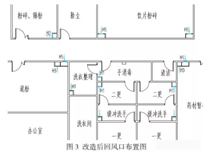 系統自調試階段就陷入麻煩,壓差調不正確,要不混粉、飲片粉碎等回不了風,要不潔凈走廊保證不了+15Pa 的正壓,二更和緩沖洗手出于同一壓力。施工單位用阻塞混粉等低壓力房間的回風口、關小其送風口的方法終于調試壓力成功,交付使用。