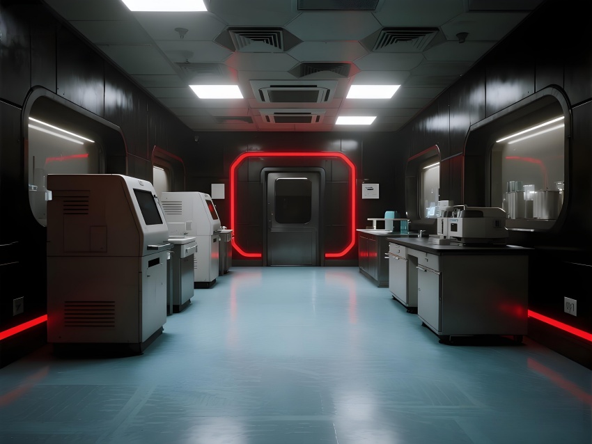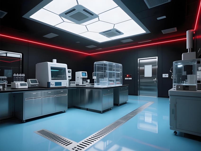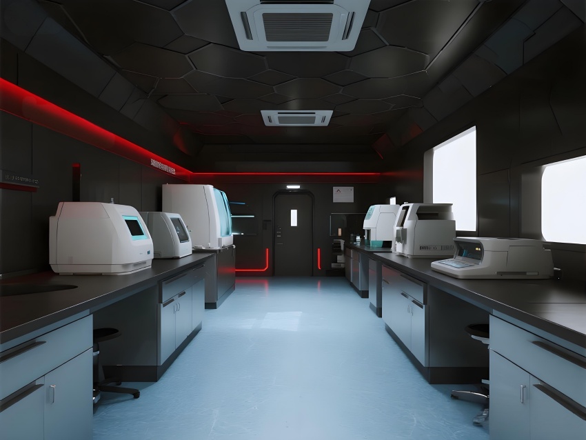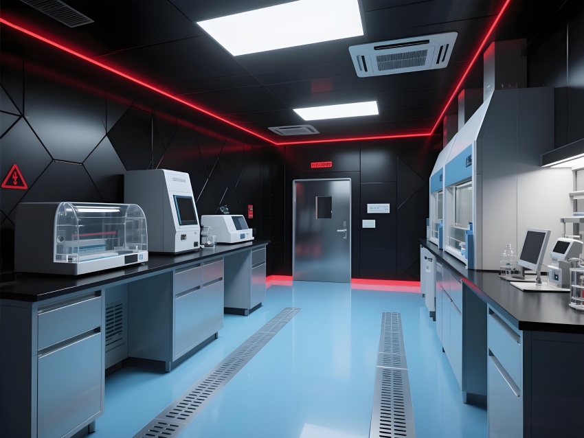 本實(shí)驗(yàn)室采用"生物防御未來主義"風(fēng)格,通過銳利的幾何切割與警示色彩構(gòu)建科研防護(hù)美學(xué)。核心實(shí)驗(yàn)區(qū)以啞光黑墻面搭配紅色應(yīng)急光帶,形成視覺危險(xiǎn)預(yù)警,與清潔區(qū)的冰藍(lán)色環(huán)氧樹脂地面構(gòu)成強(qiáng)烈功能區(qū)分。設(shè)備區(qū)的金屬原色與透明PCR儀散熱孔展現(xiàn)工業(yè)精密感,天花板的六邊形送風(fēng)單元與地面導(dǎo)流孔形成垂直氣流可視化。防爆玻璃觀察窗嵌入電子壓差顯示屏,氣閘室的黃色斜紋標(biāo)識強(qiáng)化生物安全等級過渡。通過冷白光與設(shè)備界面藍(lán)光的層疊照明,在滿足BSL-2物理防護(hù)要求的同時(shí),營造出科幻電影般的嚴(yán)謹(jǐn)科技氛圍,傳遞基因工程特有的精密與危險(xiǎn)并存的特質(zhì)。