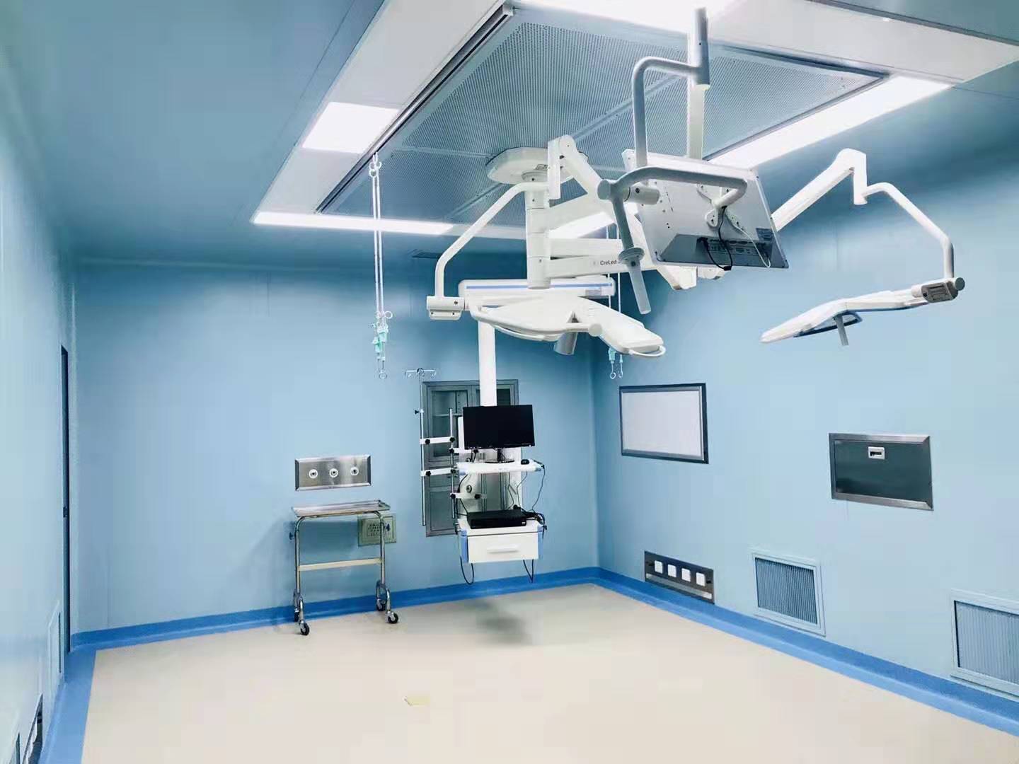 手術部墻體及吊頂均采用防菌50系列夾芯彩鋼隔熱板,企口型,厚度為0.426mm,雙面貼膜,潔凈手術室墻面必須達到無縫、氣密效果,色彩符合現代手術室的要求,視覺感觀舒適。潔凈走廊加裝200mm寬厚度為0.8mm不銹鋼防撞帶。